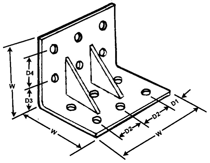 Angle Stiffeners improve the rigidity of any 90° wood connection. They develop the full allowable capability of bolts. Angle stiffeners also function as heavy-duty truss tie-downs. Because of the wide range of allowable loads for bolts when loaded parallel and perpendicular to grain, and at intermediate angles, load values are not listed. These can be obtained from National Design Specification for Wood Construction, published by American Forest and Paper Association.